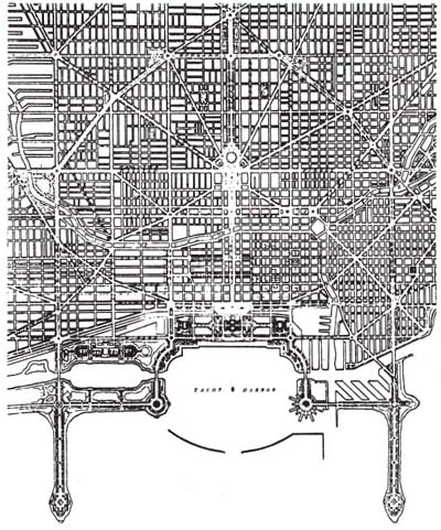 D. Burnham: Plano del sector céntrico para Chicago en 1909 (derechos del Commercial Club of Chicago, 1909).