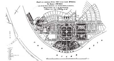 Hygeia: Plano de una ciudad modelo por J.B. Papworth en 1827. Diseño de escuela romántico-clásica para Ohio River, Kentucky, Cincinnaty.