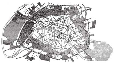 París: Plan para París por G.E. Haussmann, 1853–1859. Las líneas pesadas negras son las avenidas nuevas abiertas por zonas ya habitadas. Las líneas más livianas son las vías construidas en los suburbios. Nuevos distritos en achurado cruzado, parques públicos en achurado simple.