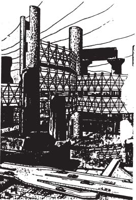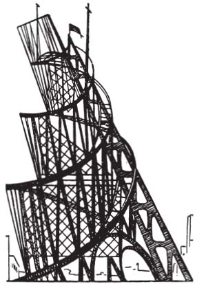 La perspectiva constructivista del urbanismo y del desarrollo en la Unión Soviética, fue hacia un país nuevo; mecanizado, industrial, dedicado al trabajo masivo, lleno de rascacielos, radioestaciones, sobrevolado por aeroplanos. La arquitectura es austera, de gran riqueza formal, con expresión de los esfuerzos mecánicos y el trabajo de los elementos y materiales (Torre Monumento para la 3a Internacional de V.E. Tatlin)27 (figura 2.10), o fantasías tectónicas, como las de Lavitsky, ciudades casi enteras de vidrio, con edificios colgantes y giratorios espectaculares.