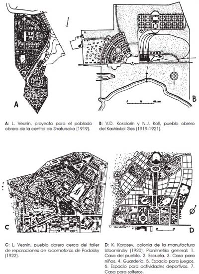 Se produce una fecunda labor en Urbanismo en la Unión Soviética: se crean nuevas ciudades, centros descentralizadores agrícolas y zonas industriales (Giprogu, Belograd). Los contactos con los urbanistas alemanes se establecen desde 1920; Ernst May (Ciudad Lineal de Magnitogorsk) y Hans Meyer, trabajan en la U.R.S.S. Se estudian varias ciudades satélites y ciudades lineales, como Stalingrado, Elektrovoz, Lenikahan. La zonificación estricta, la vivienda en bloques de hasta 2.000 habitantes, la integración de funciones agrícolas e industriales, de esparcimiento y áreas verdes, son corrientes en las ciudades del período. La Unión Soviética se mecaniza y electrifica. El progreso se convierte en mística (figura 2.11).