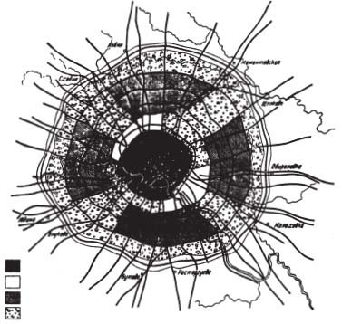 S. Shestakov, esquema de Plano general para el «Gran Moscú» (1925). En rayado cruzado, los barrios centrales; en blanco, las zonas industriales; en rayado simple, los nuevos barrios; y en círculos, las zonas verdes.