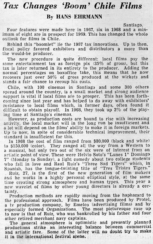 El balance de 1968—“este ‘año primero del nuevo cine chileno’”, según Leiva (30)—demuestra que en efecto se practica la “política de puertas abiertas” prometida por Kaulen en 1965 después de ser nombrado presidente de Chile Films (Ecran 5 enero 1965: 46). La eficacia global de la política democratacristiana se comprueba con el “boomlet” que vive la producción cinematográfica chilena de 1967 y 1968, según la ingeniosa expresión de Ehrmann en su brillante síntesis para la revista Variety (“Tax Changes ‘Boom’ Chile Films”, 8 enero 1969: 130). En un ambiente general de optimismo, las películas y los proyectos en marcha “strike an interesting balance between commercial and artistic fare” (“logran un equilibrio interesante entre actividad comercial y artística”).
