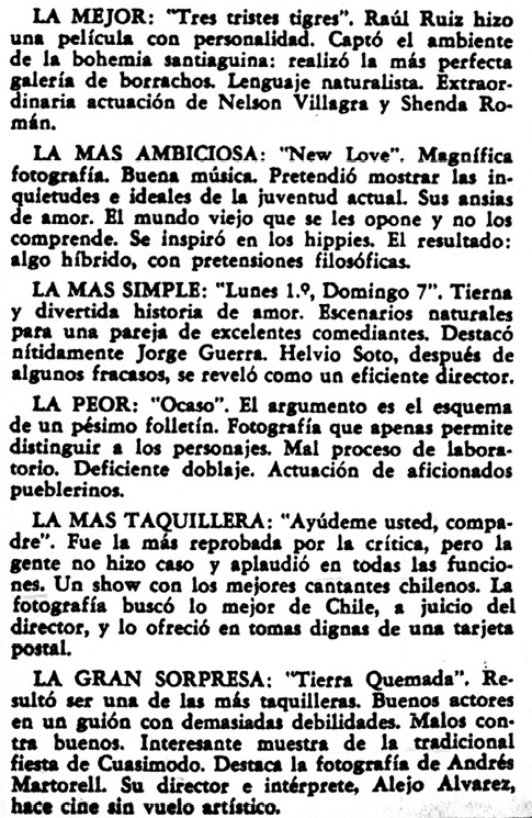Tres tristes tigres, “una película con personalidad”, es “la mejor”; Lunes 10, domingo 7, “tierna y divertida historia de amor”, es “la más simple”; New Love resulta “la más ambiciosa” por sus “pretensiones filosóficas”; Ayúdeme Ud. compadre, “un show con los mejores cantantes chilenos”, es “la más reprobada por la crítica” y “la más taquillera”; Tierra quemada, “la gran sorpresa” por su éxito con el público, es un “cine sin vuelo artístico”; Ocaso se califica como “la peor” (30).