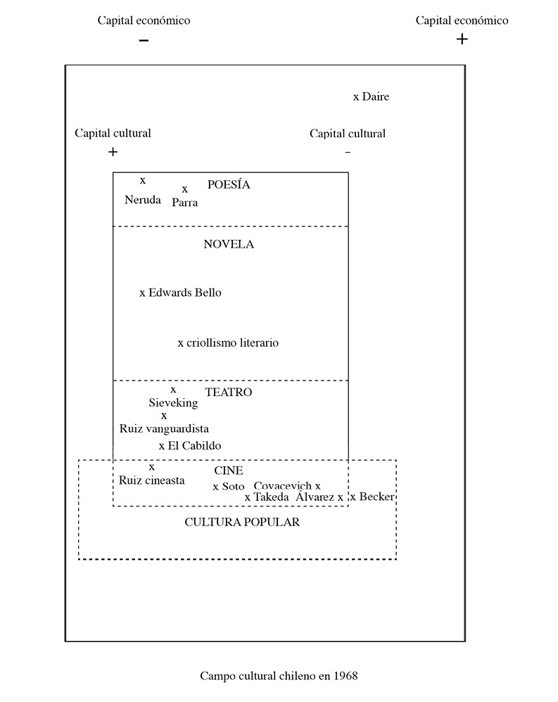 El ojito de Pepe Daire demuestra, pues, su clarividencia en los negocios. También ilustra una actitud común a la derecha política, como constata con cierta ironía María de la Luz Marmentini: “No sabían que el cine pudiera influenciar la opinión pública. ¡Cómo, si la tele y las películas eran para entretenerse! La única película que el candidato, muy estimable por cierto pero demasiado antiguo, don Jorge Alessandri había visto era La Violetera lo que lo había dejado prendado de la Sara Montiel” (E-mail, 20 nov. 2006). Si tomamos la precaución del empresario frente a un cine no convencional como punto de partida para examinar los modos de producción de las seis películas del 68 descubrimos un diseño cuya pauta general coincide con el modelo trazado por Bourdieu para distinguir el campo cultural del campo económico. Según Bourdieu, el campo cultural autónomo es el mundo económico al revés en el sentido de que la relación entre el capital económico y el capital cultural es inversamente proporcional. Es decir, el mayor prestigio cultural no va unido necesariamente con la mayor ganancia y, al revés, el menor prestigio puede ser lucrativo. El caso típico de esa relación es el de la poesía pura frente a la novela de folletín (The Field of Cultural Production 37-52). En el caso del cine chileno de mediados de los sesenta se trata de un sub-campo cultural emergente con fronteras abiertas hacia el campo heterónomo de lo económico y el campo de la producción cultural, tanto literaria como popular. La relación inversa entre éxito comercial (capital económico) y éxito crítico (capital cultural) es evidente. Al mismo tiempo, el mundo de los negocios fomenta la producción de capital cultural bajo con considerable capital económico.