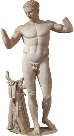 Policleto es uno de los escultores mejor conocidos del siglo V a.C., sobre todo por sus obras relacionadas con el atletismo, como ésta. La figura se está atando el pelo con una cinta, en preparación para el deporte. Sus ropas descansan a un lado, en una rama baja, ya que los atletas griegos se ejercitaban desnudos. El Doríforo de Policleto, o Canon, buscaba ilustrar la figura masculina ideal. En la pieza mostrada vemos las mismas proporciones que el escultor estableció en su Canon y la misma atención al realismo anatómico. El ideal de Policleto es un cuerpo pesado, musculoso y un tanto regordete, especialmente en comparación con las figuras más gráciles del siguiente siglo.