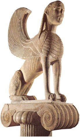 Esta criatura elegante es una mezcla de león, águila y mujer. La gracia y belleza de la esfinge pone de manifiesto su fuerza: esta criatura feroz tenía el deber de proteger todo lo que alcanzaba a ver desde su posición en lo alto de la columna. La columna y la esfinge se levantaron como una ofrenda votiva de las personas de Naxos en el santuario de Delfos. Tales ofrendas votivas, que podían incluir también figurillas y estatuas, reflejan la naturaleza “quid pro quo” de la relación de los griegos con sus dioses. Les pedían a los dioses algo y prometían obsequio votivo si obtenían su deseo. El santuario en Delfos era una ubicación popular para este tipo de oración: las personas de toda Grecia iban allí para consultar el oráculo del Templo de Apolo antes de emprender algún acto importante. Si recibían el favor de Apolo, dejaban una ofrenda votiva.