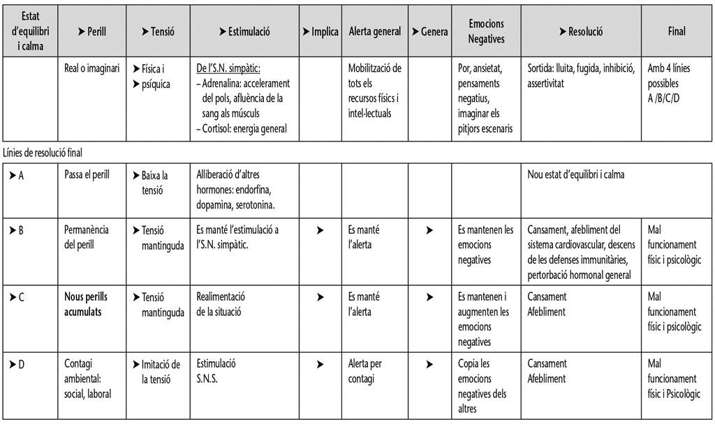 En el quadre següent, presentem el procés biopsíquic de la resposta d’estrès amb les possibles variants. Els circuits més habituals són l’A i el B, però cal contemplar especialment el D perquè està relacionat amb l’estrès social: situacions de crisi, bombardeig dels mitjans de comunicació, manipulació política, deteriorament ambiental i social de l’empresa...