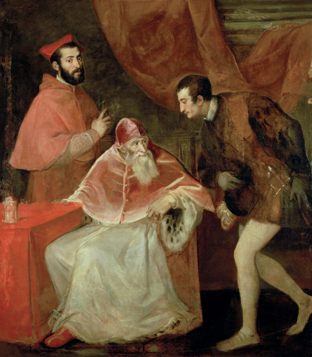 Titian (Tiziano Vecellio), Pope Paul III and his Nephews (Alessandro and Ottavio Farnese), c. 1545-1546.