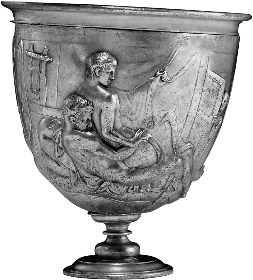 The Warren Cup is a luxury drinking vessel made of silver and created for use in a provincial home of the early Roman Empire. It would have been used in specific decorative architectural spaces (personal homes of the wealthy) in which vessels with scenes of lovemaking (usually heterosexual) were found. They were meant to entertain the guests with their engaging imagery and fine craftsmanship (Clarke, p.279). Because of its high quality and unique subject matter, the Warren Cup has challenged “the modern viewer to consider a broad range of artistic, cultural, and social issues” concerning male homosexuality in Roman times (Clarke, p.277).
