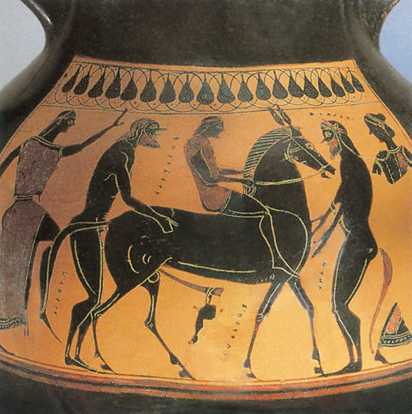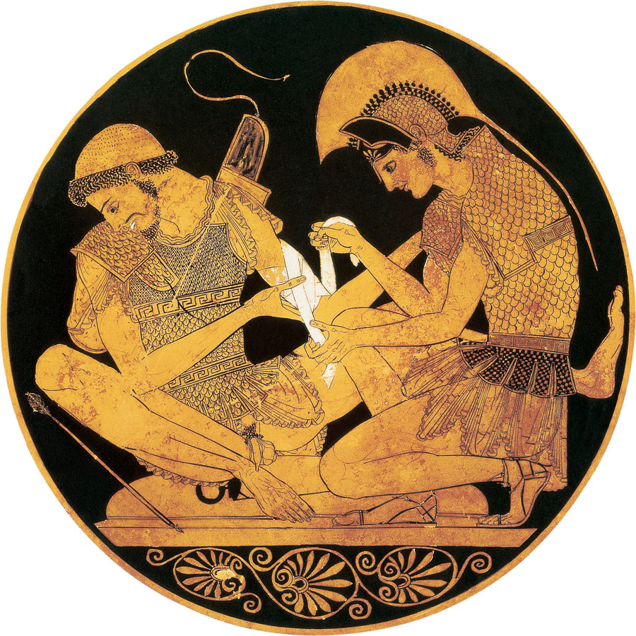 In the eighth-century-BC epic verse of Homer called the Iliad, we find the most celebrated of all male-male unions in the comradeship of Achilles and Patroclus during the Trojan War. In the story, Homer glorifies the friendship between the two but does not mention that they were lovers. The classical Greeks themselves interpreted Homer as referencing their own social practice of pederasty and claimed Achilles and Patroclus as a pederastic pair. Achilles, a young warrior described as the most handsome and noblest of the Greeks, fell into profound grief when his companion Patroclus was slain by Hector, son of the Trojan king Priam. Achilles and Patroclus first appear in art toward the end of the sixth century BC on Athenian black-figure vase paintings (Saslow, p.16). Several red-figure vases from the late sixth century BC to the fourth century BC show the loving bond between the two warriors.