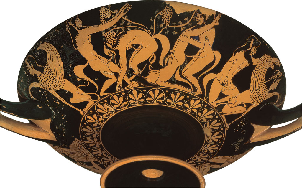 At around age eighteen, an eromenos became an erastes and was expected to marry, father children, and take an active role in the pursuit of younger men. However, the imposing of such strict social rules often invited transgressions. These were sometimes depicted on vase paintings and could be linked with Plato’s frequent admonitions and warnings against sexual overindulgence by Athenian males. Although of concern to the ancients, these transgressions were minor compared with the gravest taboos of all – oral and anal sex. These activities were regarded as beneath the dignity of the Athenian male citizen and were reserved for women, male and female prostitutes, foreigners (called barbarians by the Greeks), and slaves. Along with female passivity, anal penetration and oral sex were associated with bestial activity commonly represented on vases showing satyrs or other mythological creatures. Satyrs (mythological beings who are half-man, half-goat) are symbols of the conflict between civilised man and his uncontrollable animal passions and desires. Their virility was insatiable and they are typically shown inebriated, with enormous genitals, copulating, or masturbating.