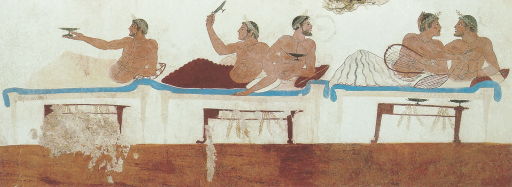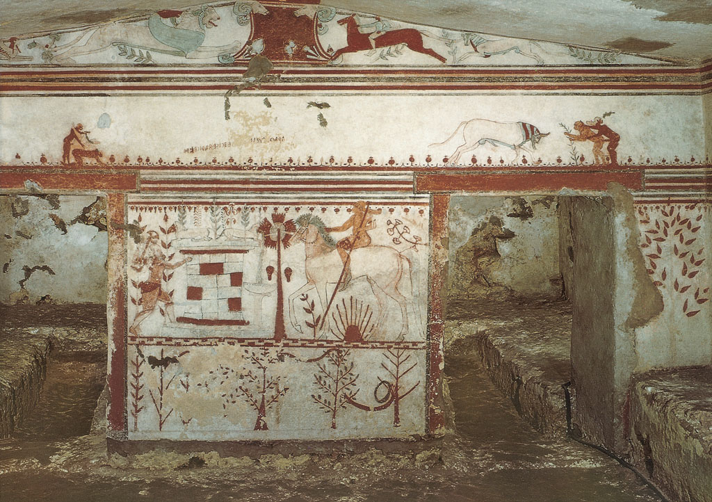 The Greeks were avid traders, explorers, and conquerors. For centuries before and after the classical period (fifth century BC), the Greeks imported their ideas and experiences to other countries and cultures. When they arrived in what is now Italy, they encountered the native Etruscans who had occupied the central and northern areas of that land between the ninth and third centuries BC. Our knowledge of the art and origins of the Etruscans is very limited, but what is certain is that they practised very different customs from the Greeks and held specific views about death. Prior to contact with the Etruscans, the concept of life after death was alien to Greek thinking and practice. The Tomb of the Diver at Paestum in southern Italy and Tomb of the Bulls in Tarquinia near Rome are just two examples of decorated tombs that show the extent to which the Etruscans utilised a large amount of sexually charged symbols and figures in their funerary art.
