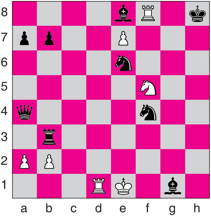 El diagrama es un claro ejemplo de lo que acabamos de exponer. Un simple peón pasado, en este caso, el que se encuentra en la casilla e7, puede tener un valor real mucho más alto que el de un alfil o un caballo. La torre blanca en f8 tiene al rey en jaque, que a su vez se ve intimidado por el caballo, que amenaza la casilla g7. El alfil negro en e8 impide que el peón blanco se promocione por una pieza mayor que acabe por sentenciar la partida. La mejor solución en este caso es intimidar al alfil para que abandone su posición (puede hacerse moviendo el caballo blanco a d8 o subiendo la torre en d1 hasta d8, por ejemplo). Sin embargo, tampoco hay que perder la cabeza por un peón, ya que muchas veces puede echarse a perder una táctica eficaz (piénsese en el juego que puede dar un ataque realizado por un caballo y una torre).
