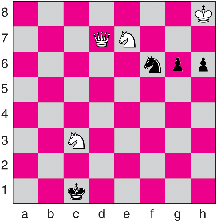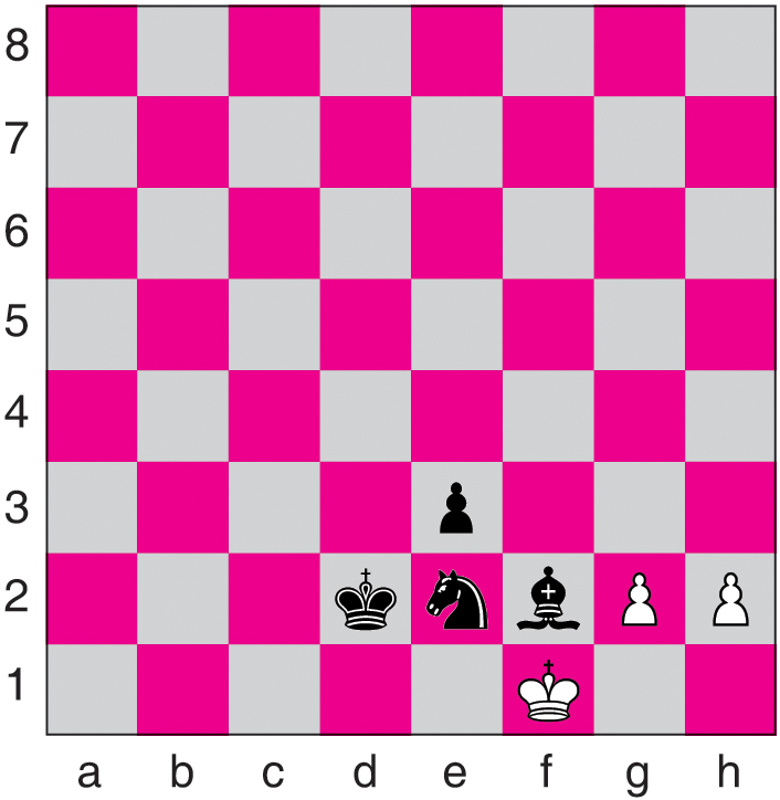 Dada la posición de las piezas, el mate es inminente: los peones no pueden asistir al rey, el cual tan sólo puede mover a f2 para evitar el jaque del alfil, si bien el peón negro acabará por sentenciar la partida. Tan sólo queda una opción: que el jugador de las blancas admita que su rey está ahogado.