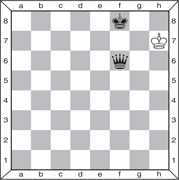El blanco no tiene forma alguna de detener las amenazas de jaque del adversario, pero igualmente puede evitar la derrota gracias al jaque continuo. De hecho, después de 1. Kf8+ el negro, al no poder detener el jaque ni capturar a la dama, debe desplazar al rey, jugando 1. ...Lh7; pero entonces el blanco, jugando 2. Kf7+, obligará al rey negro a volver a h8, movimiento que irá seguido nuevamente de un jaque en f8 y así sucesivamente. La partida es declarada tablas por jaque perpetuo, porque el blanco puede y quiere dar jaque al adversario sin interrupción y el negro no puede librarse del jaque.