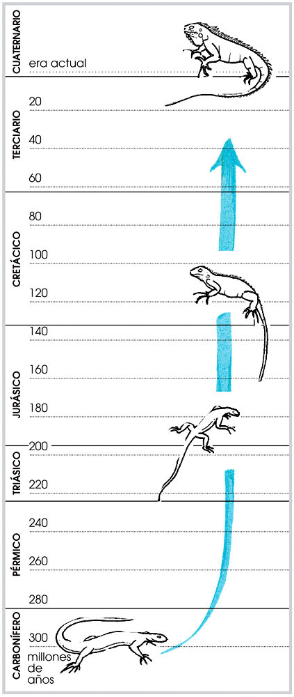 Los primeros fósiles que recuerdan a la iguana actual se remontan a finales del Cretácico (hace 120 millones de años).