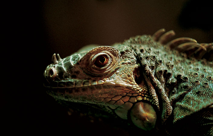 Hembra de iguana verde. Además de la coloración, obsérvense las dimensiones reducidas, respecto a las de los ejemplares machos, de las escamas subtimpánicas y de la cresta occipital y dorsal