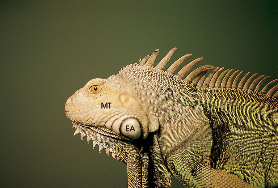 Primer plano de una iguana verde adulta. Obsérvense la membrana timpánica (MT) y la escama auricular (EA)