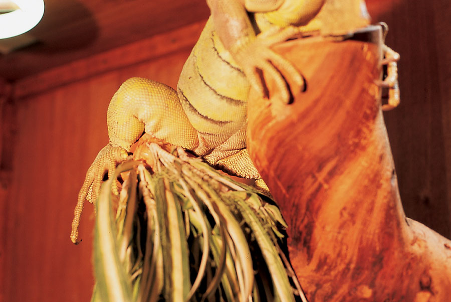 El aparato digestivo del saurio es muy largo y está repartido en amplios compartimientos; el más grande de estos es el colon saculado, que ocupa casi todo el lado derecho del abdomen, y está separado por diversos tabiques transversales que forman cavidades. En él se deposita la imponente cantidad de material vegetal ingerido, y en parte ya digerido en el estómago, que se verá sometido a importantes y complejos procesos metabólicos gracias a las colonias de bacterias y protozoos presentes en este órgano. La digestión de los vegetales acusará la influencia del calor y la humedad del ambiente en el que se críe el reptil protagonista de nuestro manual.