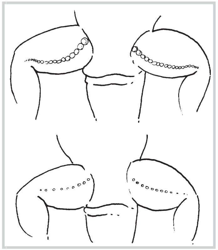 Dimensiones y disposición de los poros femorales en la iguana macho (arriba) y en la hembra