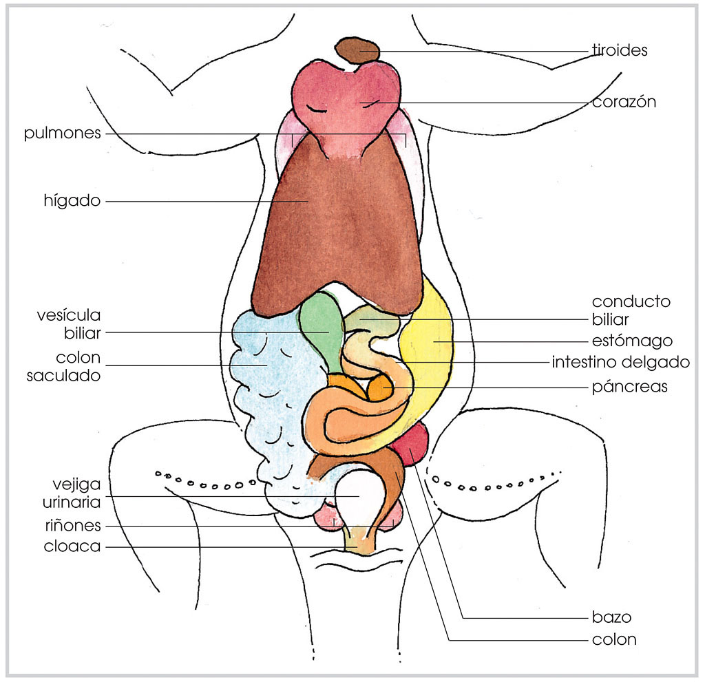 El moderado aumento de volumen del abdomen que puede observarse después de la comida de la iguana se debe a la presencia de material vegetal, a la izquierda en el estómago y a la derecha en el colon saculado.