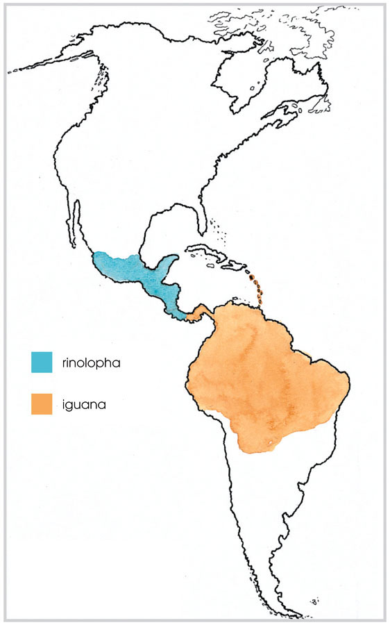 Área de distribución de la Iguana iguana, en las subespecies iguana y rinolopha