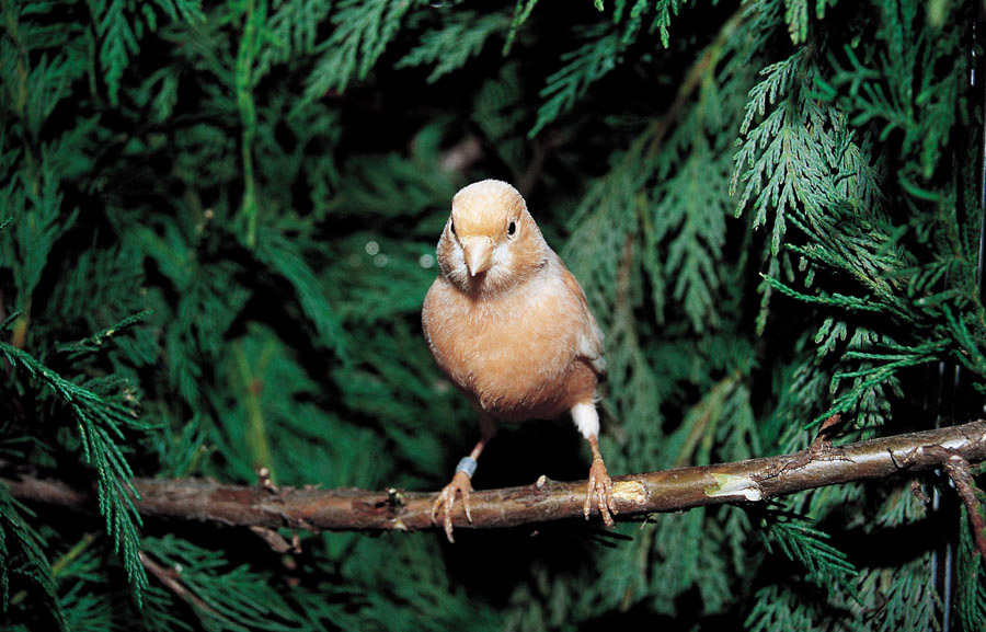 Un ejemplar «nevado» de Sajón marfil rosa, perteneciente a la categoría de canarios de color