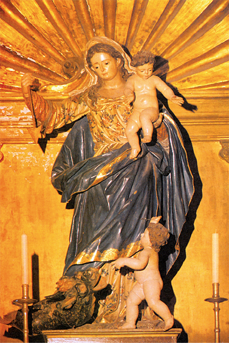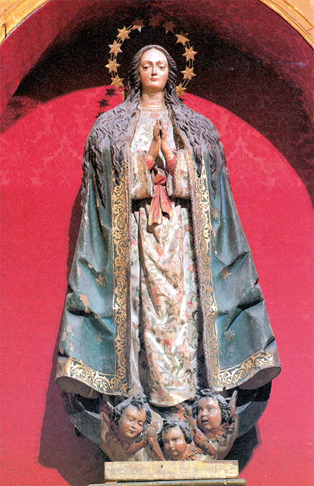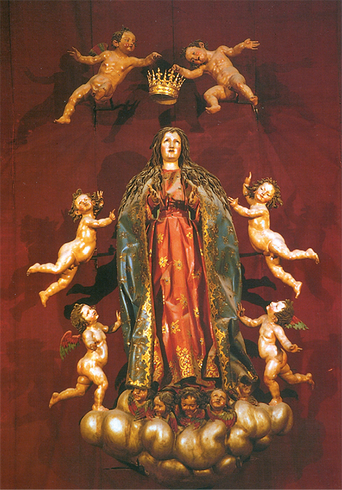 Otro de los tipos escultóricos que se definen ahora es el de la Inmaculada, a lo que contribuyen los encargos de los conventos franciscanos. Al igual que los anteriores, también será uno de los temas de mayor popularidad de Gregorio Fernández ante el fervor inmaculista existente en España[136], que pide imágenes para el culto. La serie de representaciones de este tema nos muestra a una Virgen con el rostro juvenil, cuyos largos cabellos caen por ambos lados y por la espalda, dispuestos de forma simétrica, jugando además con su ondulación. Las manos se disponen plegadas, orantes, dentro del quietismo y recogimiento que caracteriza su representación, y que es ejemplo de modestia y candor. La imagen apoya sobre un trono de ángeles o sobre la figura del dragón, símbolo del demonio vencido. Y en torno a ella, una aureola de rayos que contribuyen al efecto de conjunto, además de los plegados con los que van dotados el manto y la túnica de María. Destaquemos la belleza con la que ejecuta la Inmaculada destinada a la iglesia salmantina de la Vera Cruz, encargada en 1620. No obstante, el tipo ya lo había empezado a trabajar desde los inicios de su carrera, como así lo demuestra la Inmaculada del convento de Santa Clara de Palencia, de hacia 1610[137].