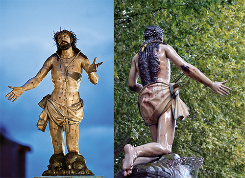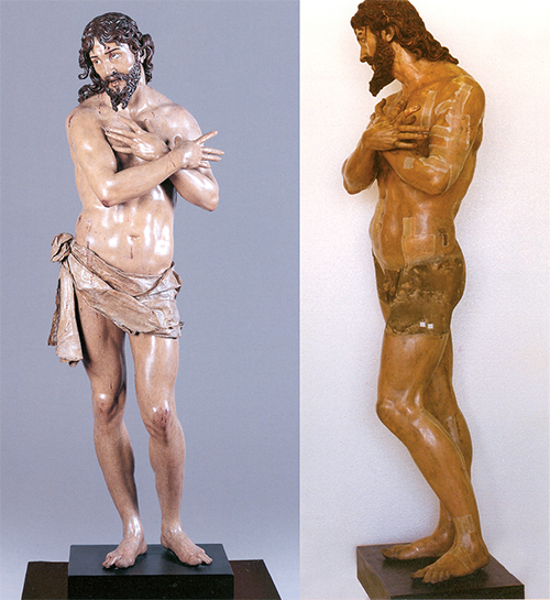 Fig. 4. Gregorio Fernández, Ecce-Homo, hacia 1621. Valladolid, Museo Diocesano y Catedralicio. La obra completa junto a la fotografía obtenida en el transcurso del proceso de restauración de la pieza.
