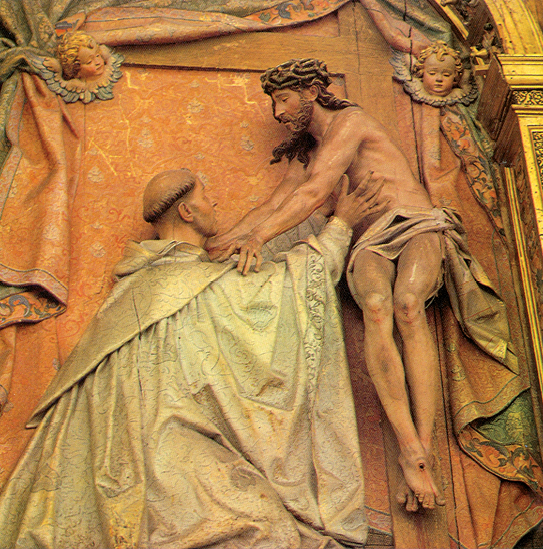 La creciente fama que el taller empieza a cosechar dentro y fuera de Valladolid avala la gran actividad que se documenta en el período comprendido entre 1611 y 1615, donde ya el artista recoge y potencia el testigo del giro que había experimentado hacia el naturalismo en la etapa precedente. La actividad se ejemplifica a través de los retablos que contrata. El mayor de la catedral de Miranda do Douro —que inicia en 1610— constituye una de las obras más espléndidas de la imaginería castellana para el marqués de Lozoya, y destaca por la escena principal con la Asunción de la Virgen concebida como un gigantesco cuadro. En el de Villaverde de Medina (Valladolid, 1612) sobresale el relieve del Nacimiento. Y en el mayor del convento de las Huelgas Reales de Valladolid, cuya escultura contrata Gregorio Fernández en 1613, descuella la imagen de Cristo desclavándose de la cruz para abrazar a san Bernardo; se trata de uno de los temas místicos más queridos por la Orden Bernarda, donde el escultor dio sobradas muestras del naturalismo con el que concibe la figura de Cristo, casi de bulto redondo. La coincidencia de la composición con la obra de Ribalta conservada en el Museo del Prado y titulada Visión de San Bernardo, hizo pensar a Martín González en el uso de un grabado por ambos artistas, realizado por Hieronymus Wierix según Palomero Páramo[127], la escena constituye una obra maestra (Fig.13), a caballo entre el misticismo y el naturalismo. En la clausura de este mismo monasterio se conserva el bellísimo relieve con el Nacimiento de Cristo, obra también de Fernández, que doña Isabel de Mendoza mandó ejecutar para su capilla privada, siguiendo las directrices del retablo mayor que también había costeado.