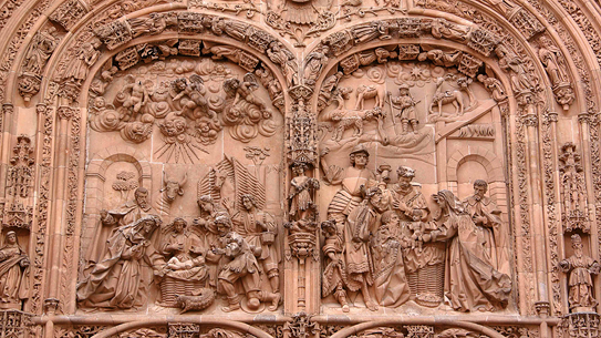 [352] La iconografía de la portada ha sido clarificada por WATTENBERG GARCÍA, Eloísa. Catálogo Monumental de la Provincia de Valladolid. Tº XVII: Medina de Rioseco. Ciudad. Valladolid: Diputación Provincial de Valladolid, 2003, p. 56: “Se sitúan en el cuerpo superior, en los nichos mayores, el emperador Heraclio y el rey Alfonso VII. En los nichos pequeños, Santa Elena y Constantino el Grande. En los laterales, el rey David y el profeta Isaías. En el cuerpo bajo, en dos relieves, se presentan: Santa Elena hallando la Santa Cruz en el Gólgota y santa Elena con el obispo Macario constatando la veracidad de la Santa Cruz al sanar milagrosamente a una enferma, ambas escenas según el relato de Rufino de Aquilea, con algún elemento de la Leyenda Dorada. En los nichos, las sibilas Cumana y Samia”, que profetizaron la muerte de Cristo en la Cruz.