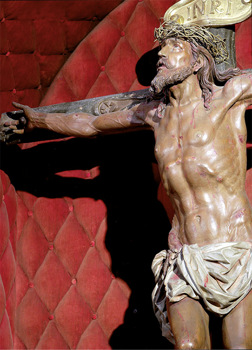Dentro del ciclo de la Pasión, Fernández ultima en este período el tema de Cristo atado a la columna, que ya había nacido en la etapa anterior. Tenemos un ejemplo singular en la vallisoletana iglesia penitencial de la Vera Cruz, que ya estaba hecho en 1619 dentro del paso del Azotamiento que contrató para la cofradía[134]. El tema de la Flagelación, tan reclamado para las escenas de la Pasión, se acomete con las manos de Cristo atadas a una columna, cuya forma varía. Durante el siglo XVI fue habitual la columna alta, a diferencia de lo que vulgariza Gregorio Fernández, la columna baja, derivada de la que existía en la iglesia romana de Santa Práxedes, y que pudo conocer a través de algún grabado o por medio de algún sermón[135]. En el ejemplo citado, el verismo con el que fueron ejecutadas las llagas de la espalda hizo que estas se convirtieran en un motivo de veneración.