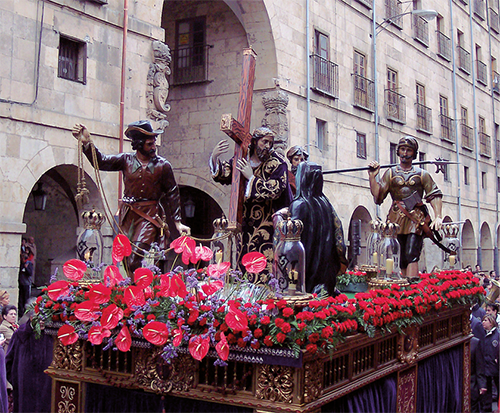 Las cofradías hunden sus raíces en la Edad Media y están íntimamente ligadas al gremio, constituyéndose en unidades básicas con las que cubrir las necesidades espirituales y materiales de sus asociados —pobreza, enfermedad (a través del hospital que solían sufragar), óbito, etc.—. El Concilio de Trento las potenció, sobre todo las de tipo penitencial —de disciplina o de Sangre—, de modo que abundan durante gran parte de la etapa en la que se prolonga el Barroco y hasta 1750, momento en el que entran en crisis fruto de su propia situación interna y de las reformas introducidas por Carlos III. En relación con la cofradía, hay que estudiar el paso procesional, muestra del culto exterior[42]. La imagen procesional y el paso —del latín passus, que significa sufrimiento— de una o varias figuras terminó por configurarse, tal y como hoy lo entendemos, entre finales del siglo XVI y principios del XVII, en paralelo a las primeras manifestaciones del realismo en nuestra plástica, y recogiendo una amplia tradición que se remonta al bajomedievo[43]. Fue entonces cuando se pasó a madera lo que hasta ese momento se había hecho en papelón o cartón y lino o sargas encoladas —debía ser el caso de aquellos grupos que no estuvieran expuestos de continuo a la devoción de los fieles—, dotándole de un estudio compositivo para lograr la multifocalidad[44], como así se pone de manifiesto en los conjuntos de Valladolid, Medina de Rioseco o Zamora[45], e iconografías como las del Nazareno[46], Cristo Varón de Dolores[47], Cristo yacente[48], el Cristo del Perdón[49] o la Virgen de las Angustias[50]. El empleo de la madera no supuso la desaparición de la tela encolada en la escultura, antes al contrario, pues se convirtió en un recurso más en la búsqueda del realismo[51].
