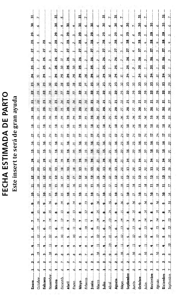 Para calcular la FPP los obstetras utilizan una tabla circular (gestograma) que contiene dicha información. Busca en las filas que están en negritas la fecha de tu última menstruación. La fecha que aparece justo debajo es la fecha estimada de tu parto.