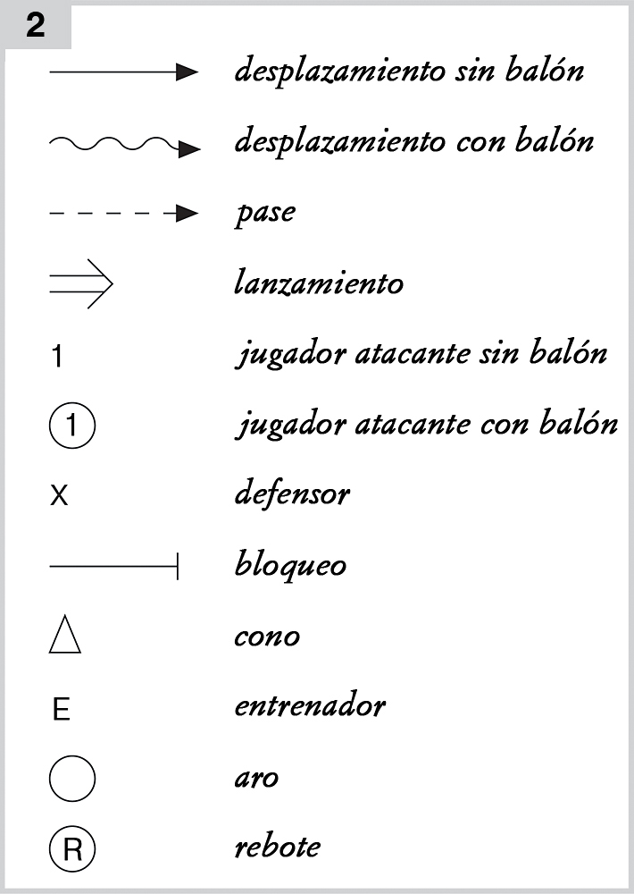 Una vez expuestas las razones por las cuales opinamos que es muy importante que todos los jugadores conozcan la ejecución de los fundamentos técnicos del baloncesto, pasaremos a describir los más importantes, tanto en lo que se refiere al ataque como a la defensa. A fin de facilitar la comprensión, hemos ilustrado las explicaciones con fotografías y ejercicios que serán de gran utilidad a la hora de programar los entrenamientos. Para representar los movimientos suelen emplearse unos símbolos más o menos estandarizados. Los más utilizados son los que muestra la figura 2.