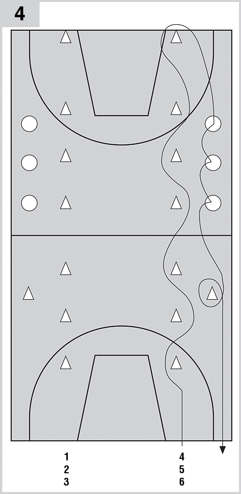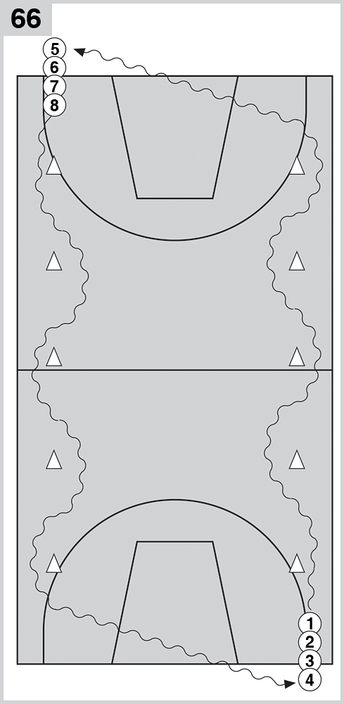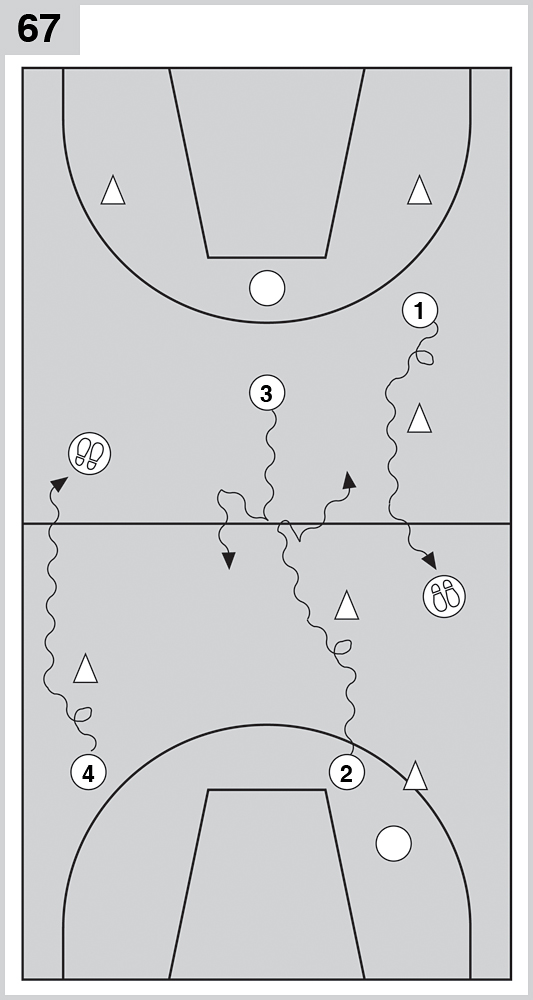 Ejercicio n.o 29: Se combinan los cambios de mano con las paradas. El jugador bota libremente por la pista. Si encuentra un círculo, realizará una parada en un tiempo dentro de él. Si se encuentra con otro jugador, ejecutará un cambio de mano entre las piernas o por delante. Si se encuentra un cono, deberá hacer un reverso (fig. 67).