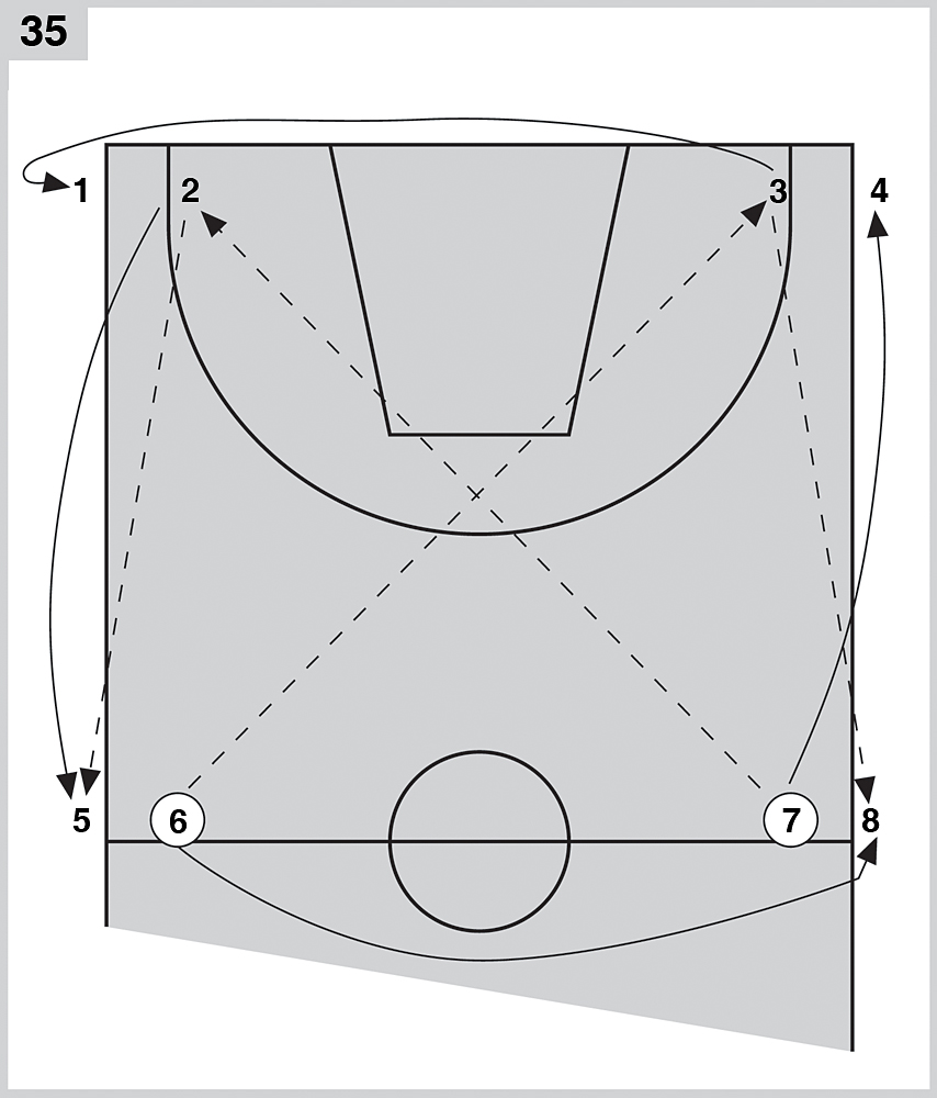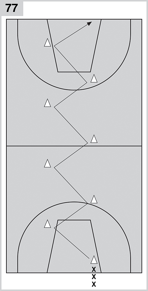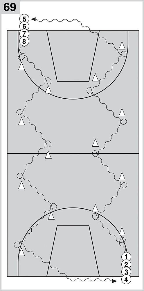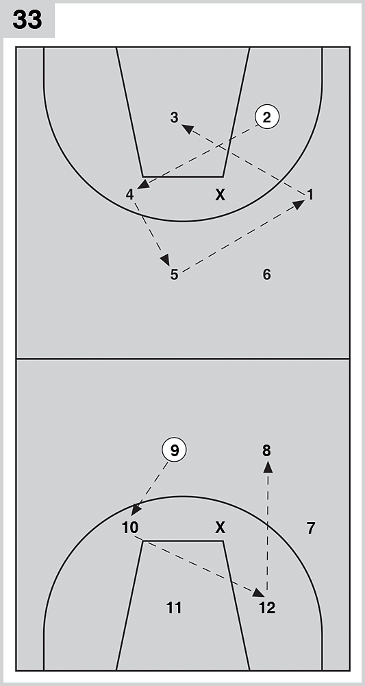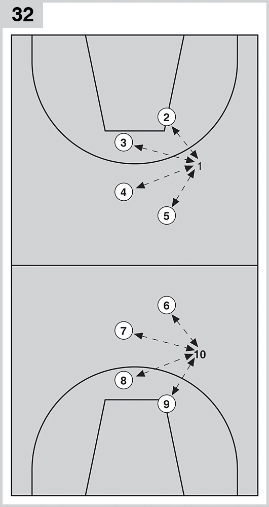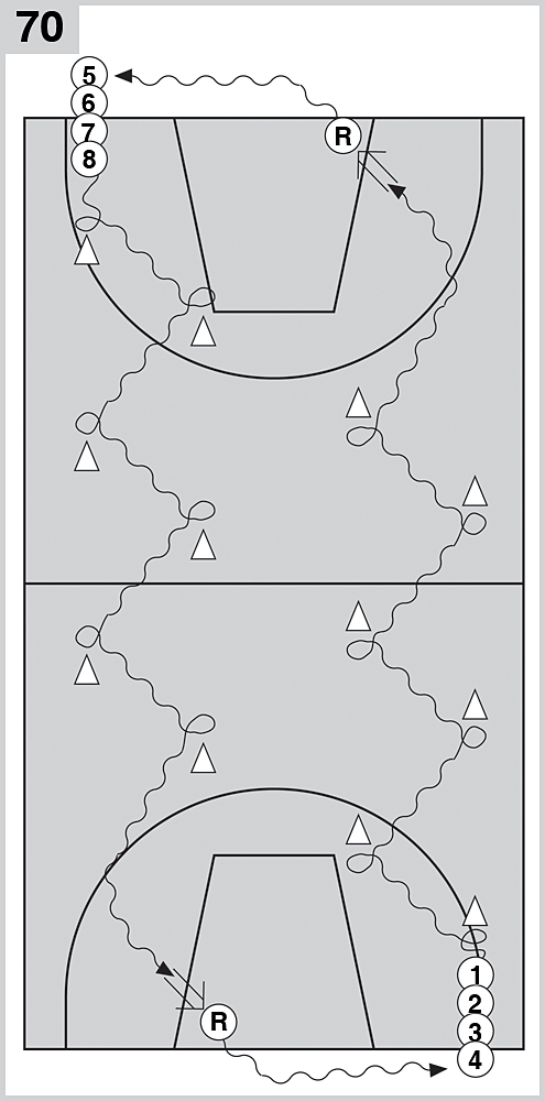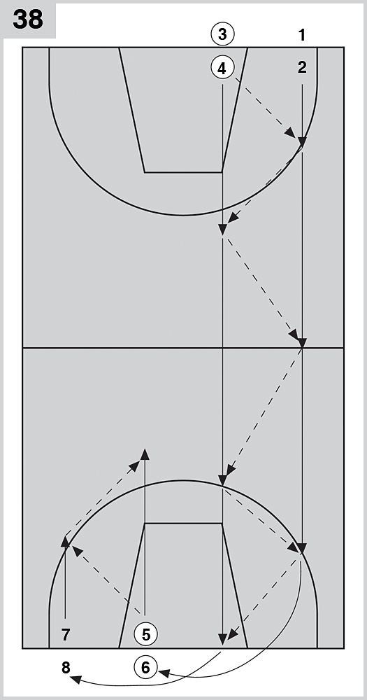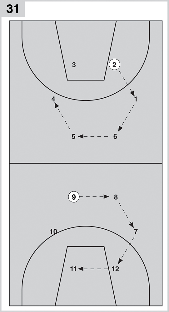 Ejercicio n.o 32: Se trata de una variante anterior en la que el jugador se dirigirá a la canasta después del último cambio de mano y acometerá una entrada o un lanzamiento (fig. 70).