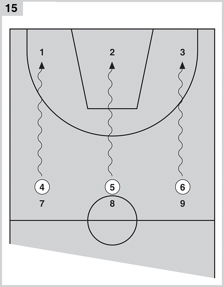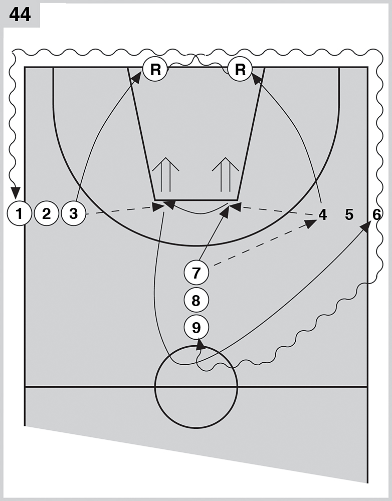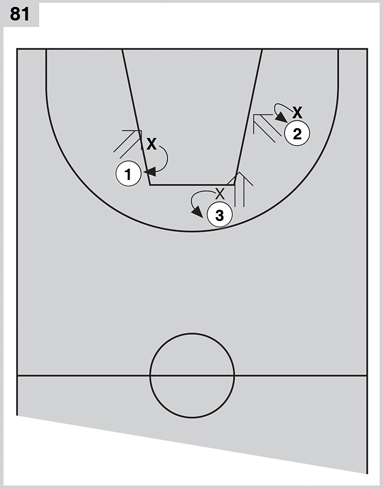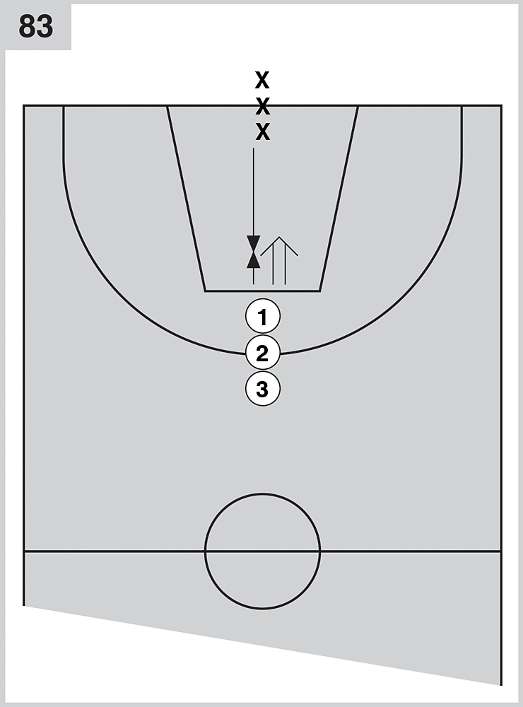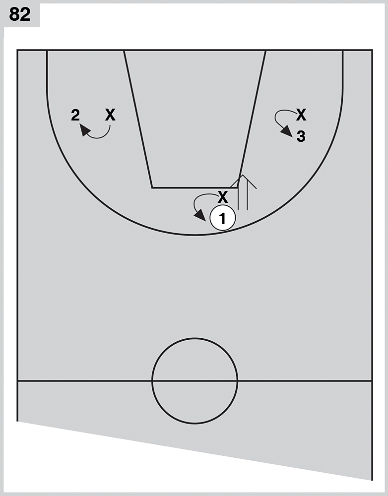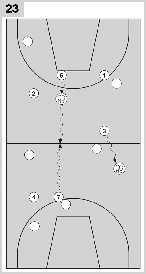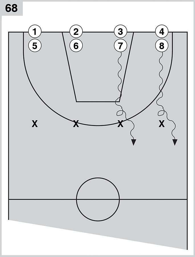 Ejercicio n.o 32: Se trata de una variante anterior en la que el jugador se dirigirá a la canasta después del último cambio de mano y acometerá una entrada o un lanzamiento (fig. 70).