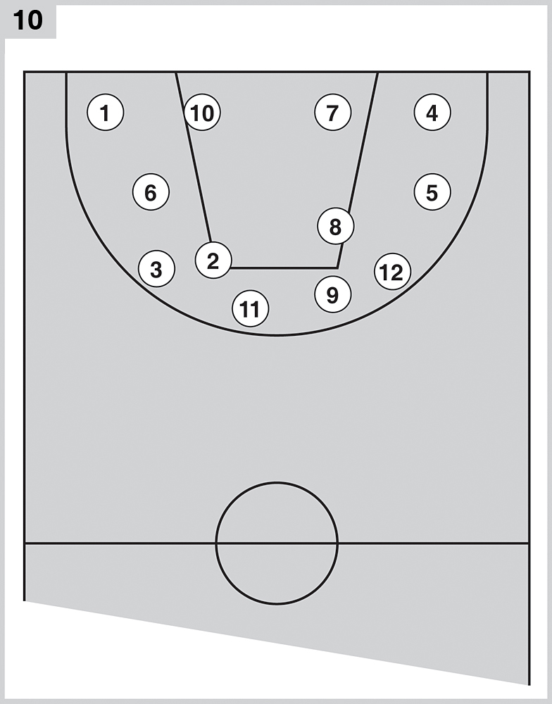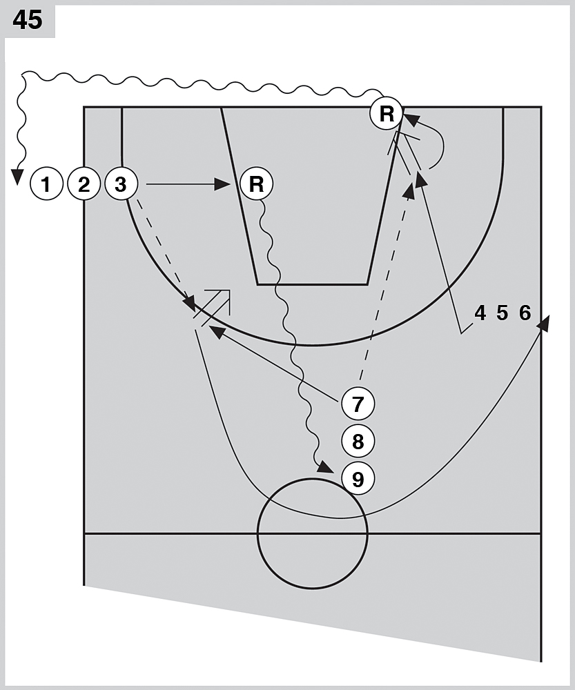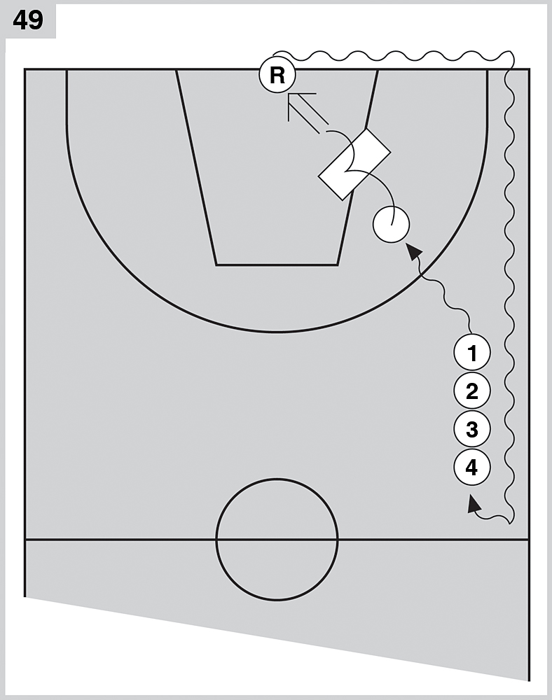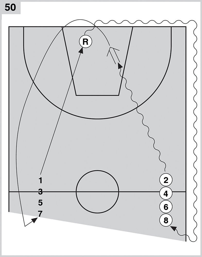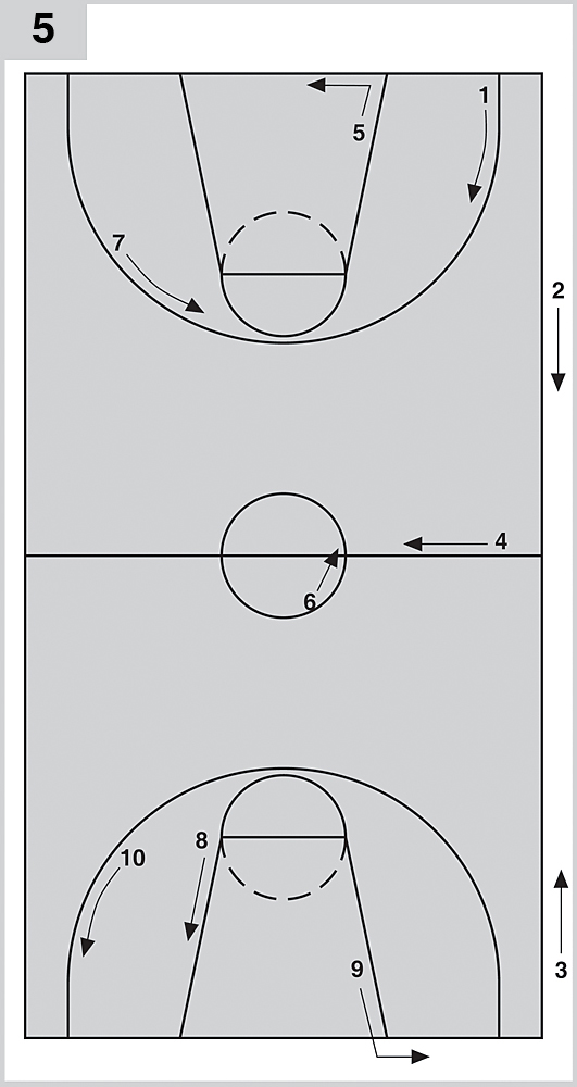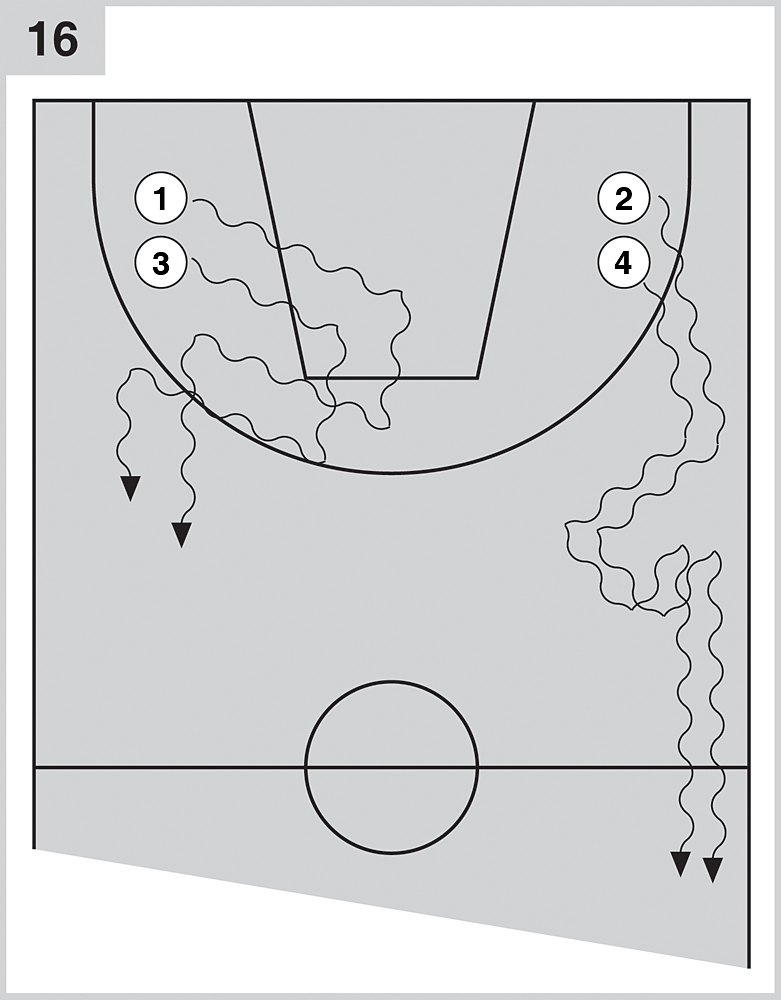 Ejercicio n.o 32: Se trata de una variante anterior en la que el jugador se dirigirá a la canasta después del último cambio de mano y acometerá una entrada o un lanzamiento (fig. 70).