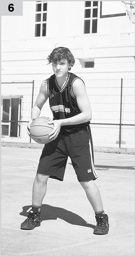 Triple amenaza: el jugador coloca una de las manos encima del balón y lo desplaza hacia su lado, a fin de protegerlo con el brazo (fig. 6). Esta posición se denomina triple amenaza porque nos permite pasar, tirar y botar desde la misma posición, sin tener que adoptar una posición intermedia, lo cual exige que la defensa esté preparada para impedir las tres acciones.