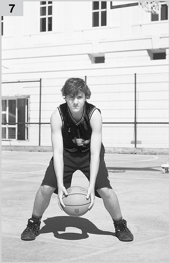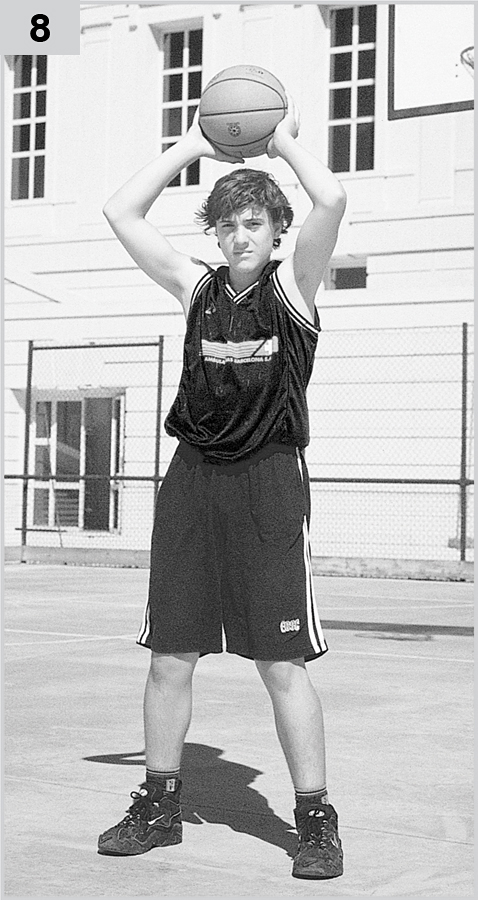 Presa alta: consiste en tomar la pelota entre las dos manos y situarla por encima de la cabeza (fig. 8). La posición del cuerpo en este caso es un poco más erguida que la básica; de hecho, estamos casi totalmente erguidos. Es muy útil para los pívot, después de coger un rebote o para dar un pase. Es poco recomendable en las fases iniciales, ya que con este tipo de sujeción no se ataca al defensa, sino que solamente se busca el pase.
