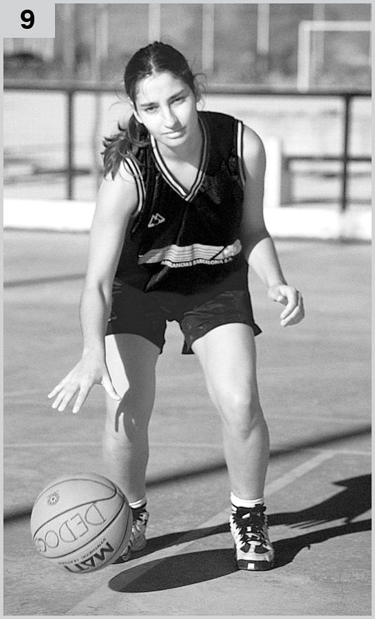 Sin más, vamos a explicar la técnica correcta del bote en baloncesto. Empezaremos en la posición de triple amenaza; impulsaremos la pelota hacia el suelo con la mano que tenemos encima, con la yema de los dedos, realizando un movimiento llamado golpe de muñeca (fig. 9), con el que se impulsa la mano desde su posición sobre la pelota hasta que la mano está totalmente dirigida hacia el suelo.