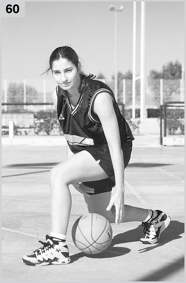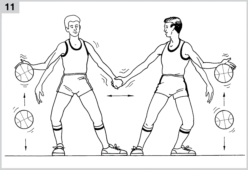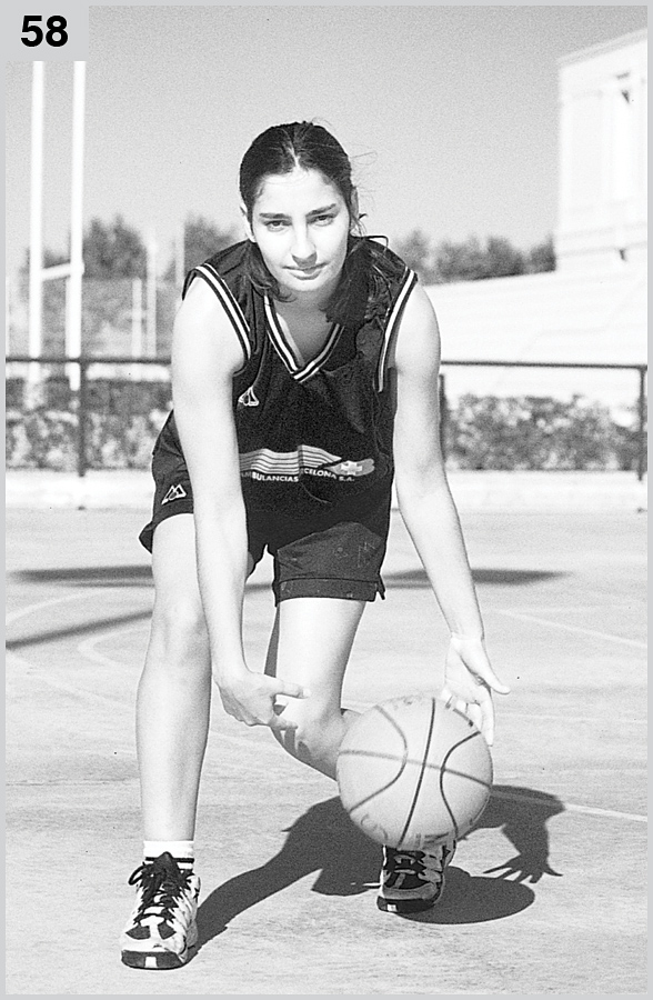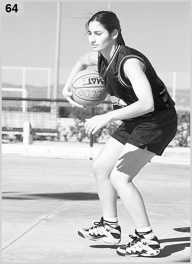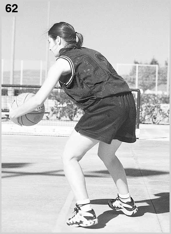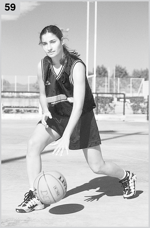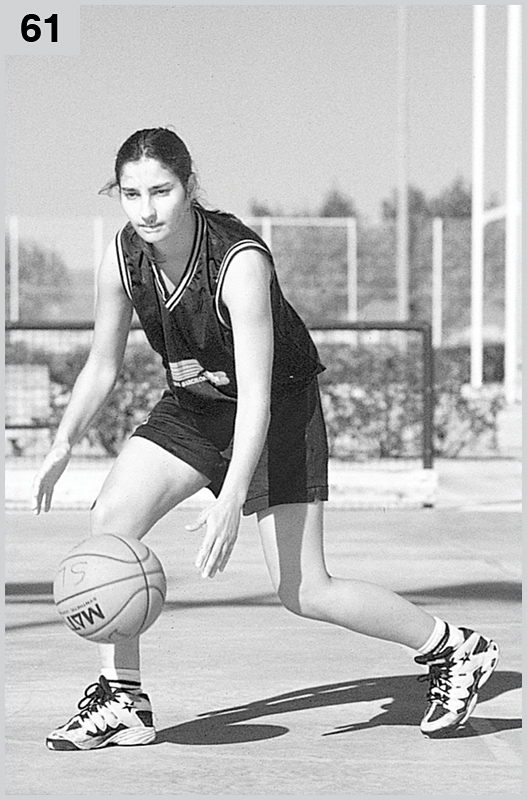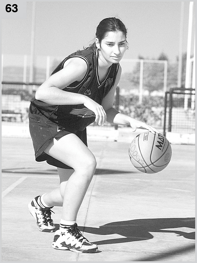 Cambio de mano entre las piernas: requiere un dominio del balón mucho mayor que el anterior, pero también es muy adecuado en la fase inicial, ya que obliga al jugador a no perder de vista ni a sus compañeros ni al defensor. Es muy útil cuando la defensa presiona, ya que es imposible que el adversario robe un balón que pasa entre las piernas. Como puede verse, se trata de un cambio de mano bastante seguro (fig. 60).