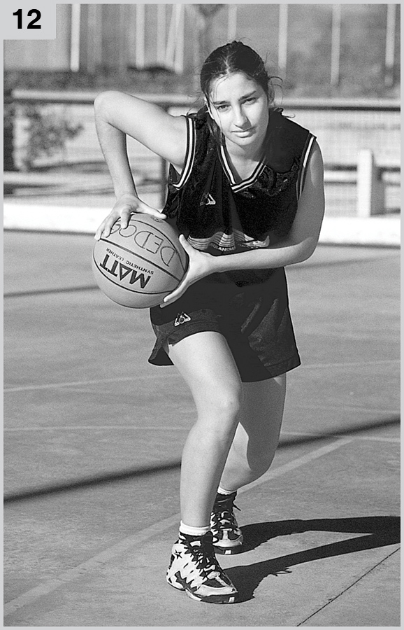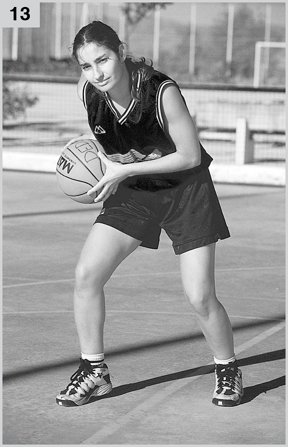 Salida abierta: es aquella en la que el primer pie que se mueve es el más cercano a la dirección que se desea tomar (figura 13). De este modo, si un jugador quiere avanzar hacia la derecha, moverá en primer lugar el pie derecho que sale. Se empieza a botar con la mano del pie que sale. Con esta salida no protegemos tanto el balón como con la cerrada, pero se va más rápidamente. Sin embargo, el riesgo de dar un paso en falso al salir es mucho mayor.