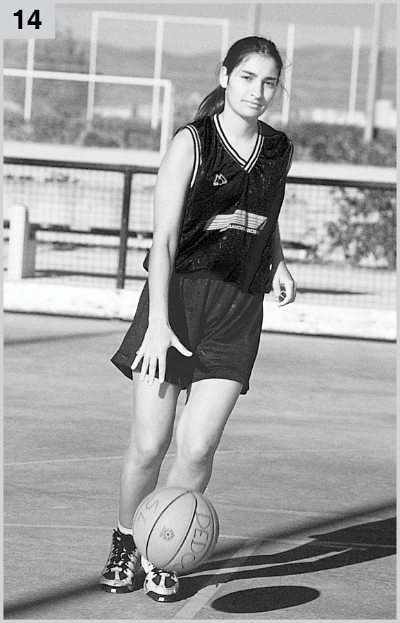 La técnica del bote en carrera es la misma que la del bote estático que ya se ha explicado. La cabeza se mantiene elevada, observando el desarrollo del juego, y se mueven únicamente la muñeca, la mano y el antebrazo (fig. 14). La única diferencia radica en que el jugador que está botando también se desplaza. El balón debe botar hacia el exterior, ya que de lo contrario, al desplazarse, los pies tropezarían. Cuanto más rápido corra el jugador, más avanzado será el bote.