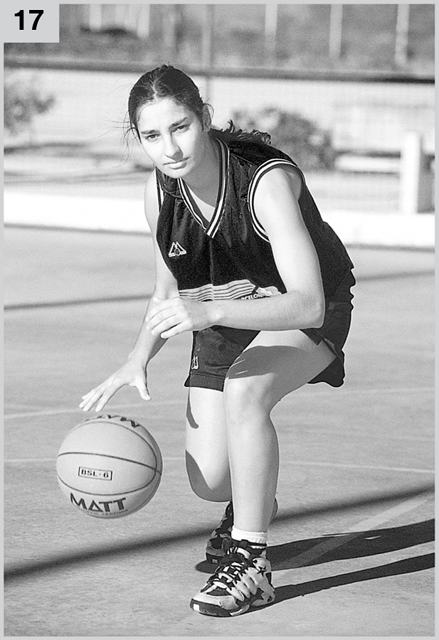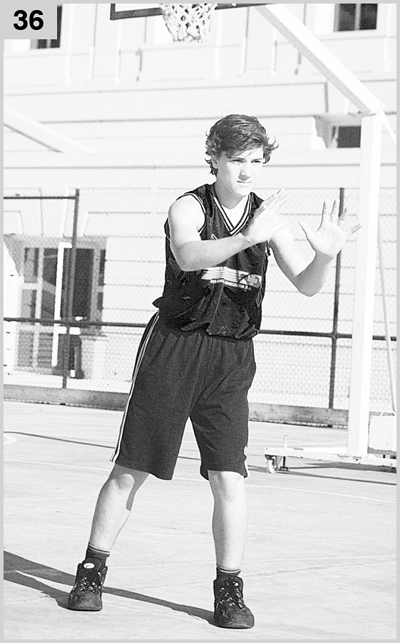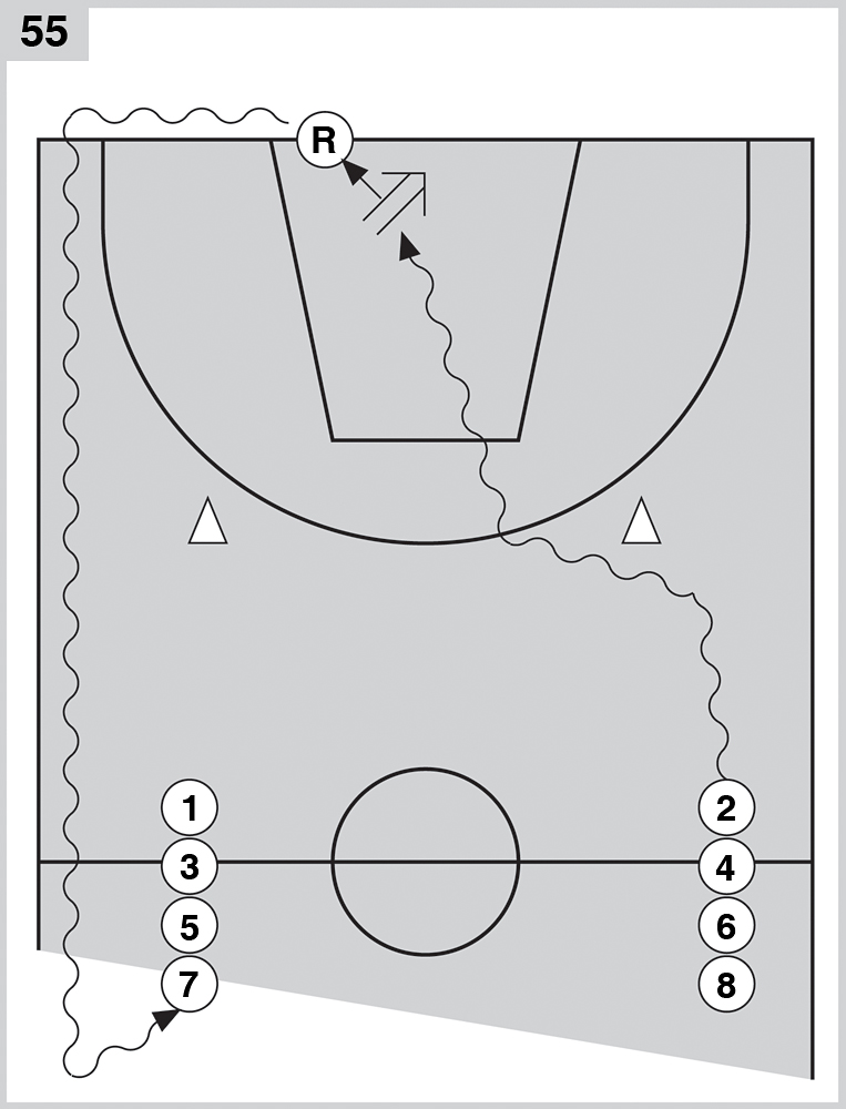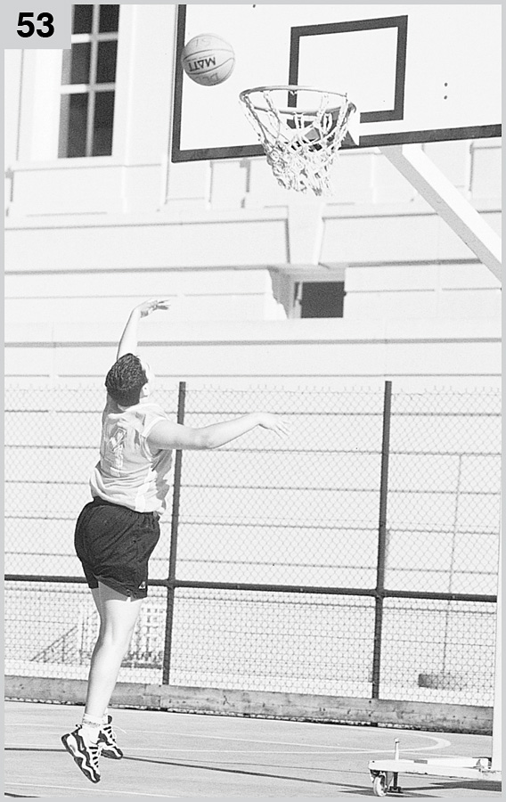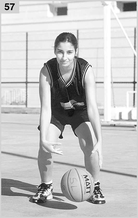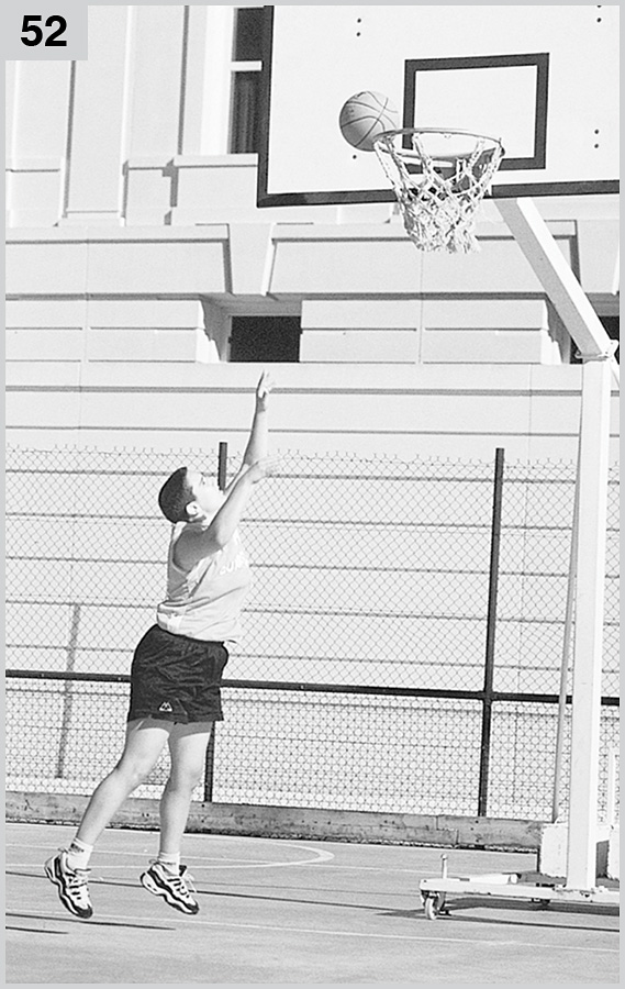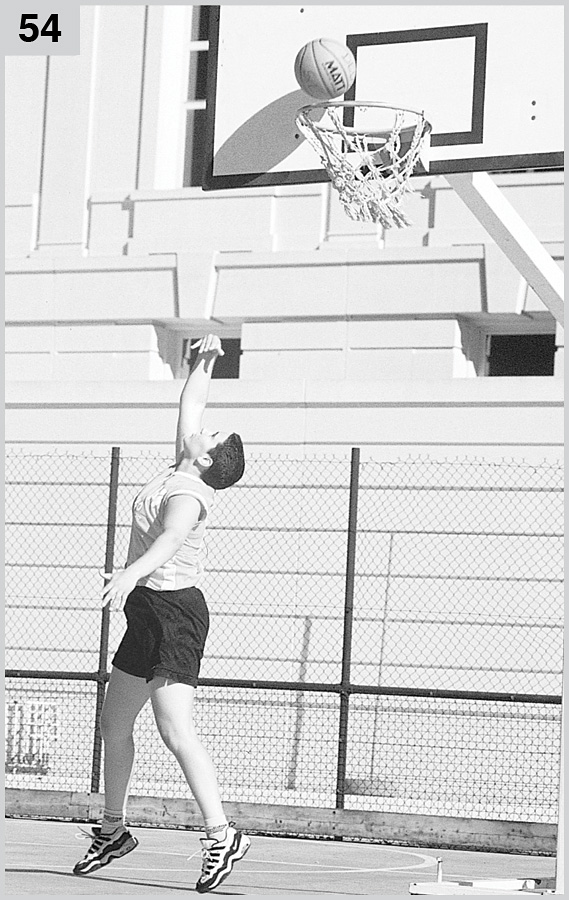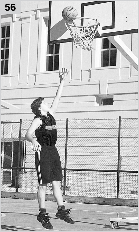 Esta curiosa técnica de tiro consiste en alinear la mano con el antebrazo, en lugar de colocarla en un ángulo de 90°. La pelota se lleva encima de la mano, y se deja ir justo cuando está al lado del aro (fig. 56).