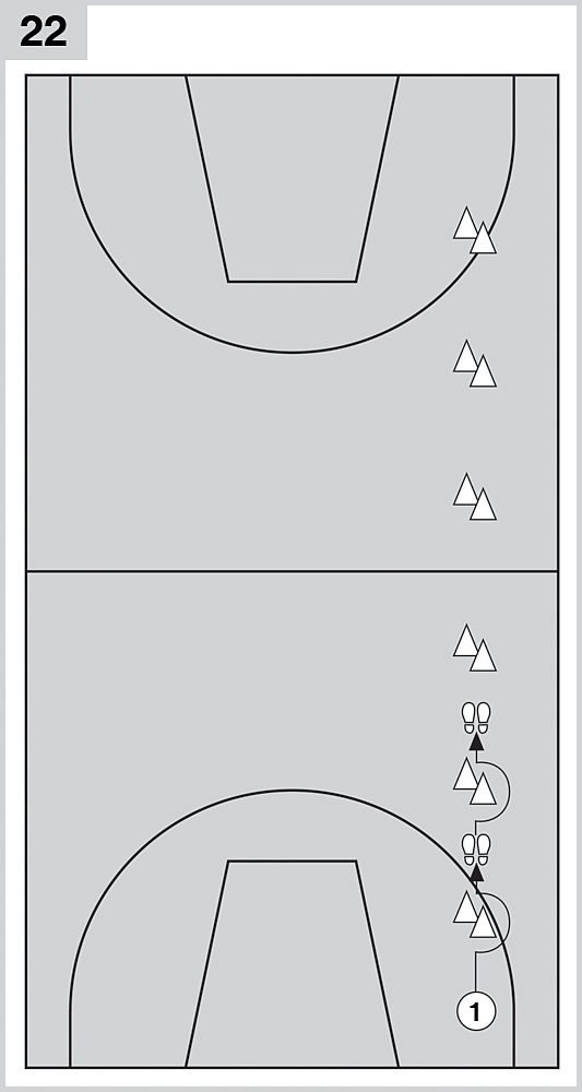 Ejercicio n.o 9: Botando, los jugadores saltan los conos que están tirados en el suelo y caen al otro lado con una parada en uno o dos tiempos (fig. 22).