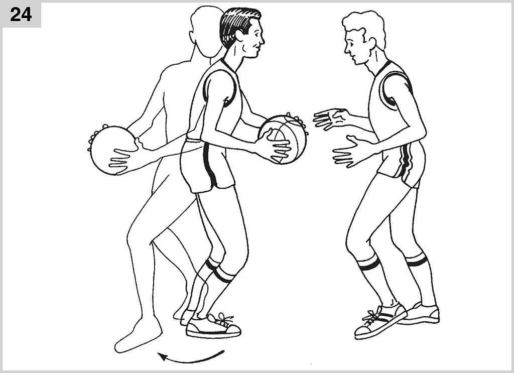 Ejercicio n.o 11: En parejas, uno de los jugadores toma el balón. El que no lo tiene intenta robárselo al poseedor, quien deberá evitarlo pivotando y sujetando correctamente el balón (fig. 24).