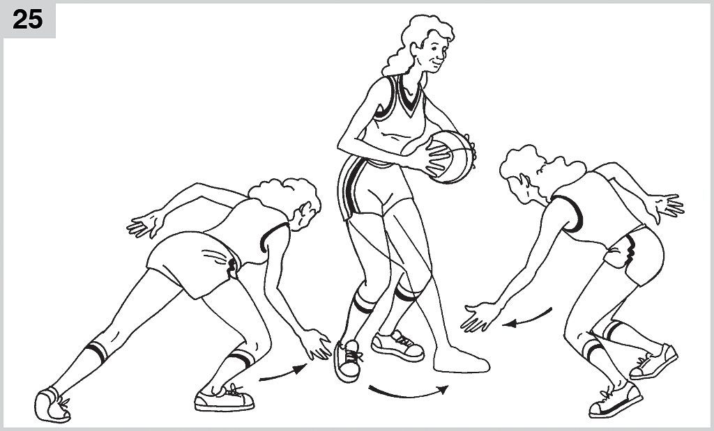 Ejercicio n.o 12: En grupos de tres, el jugador del centro toma el balón y realiza pivotes para evitar que sus compañeros le toquen (fig. 25).